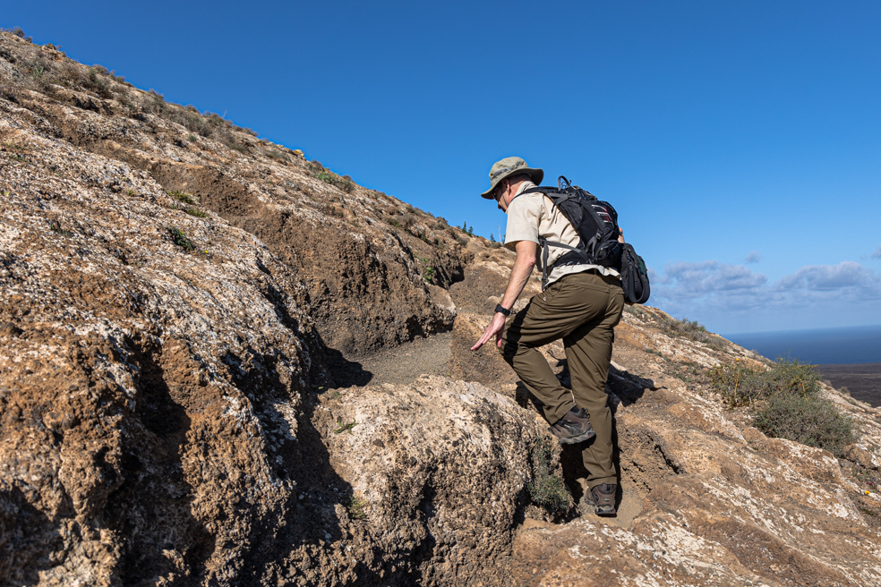 Der Weg führt durch ausgedehnte Lavafelder, in denen wir immer wieder Fotomotive für Detailaufnahmen und gelegentlich auch einige Pflanzen finden. Der Untergrund ist deutlich steiniger als der Weg zur Caldera de los Cuervos, den wir am Vortag gegangen sind. Auch bieten zahlreiche Tafeln neben dem Wanderweg Hintergrundinformationen zur Entstehungsgeschichte und Geologie des Gebiets.
