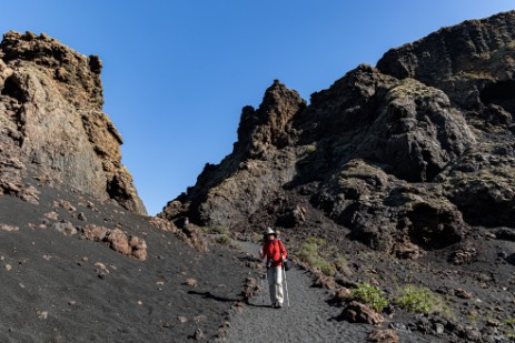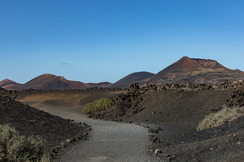 Nach kurzer Zeit erreichen wir den Krater, in den wir auf einem einfachen Weg hineinwandern können. Auf dem Rückweg haben wir die Vulkane des Timanfaya Nationalparks im Blick, die man nur auf einer organisierten Busrundfahrt erleben kann.